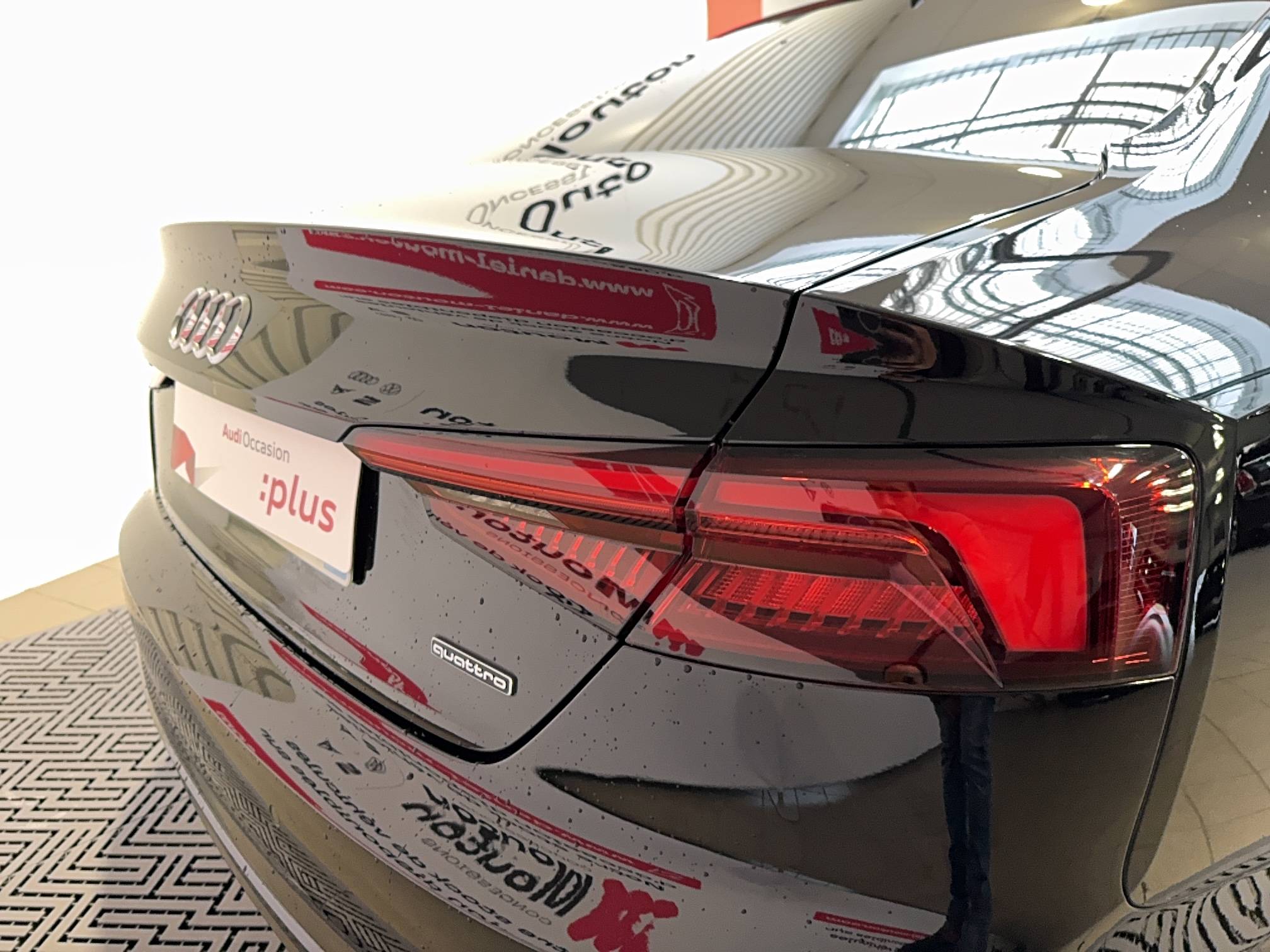 - Identification du modèle et de la technologie sur le capot de coffre inscription quattro (sur versions quattro) sur la calandre, sur le capot de coffre et sur le tableau de bord côté passager AV, sur demande sans identification de modèle/technologie à l'AR