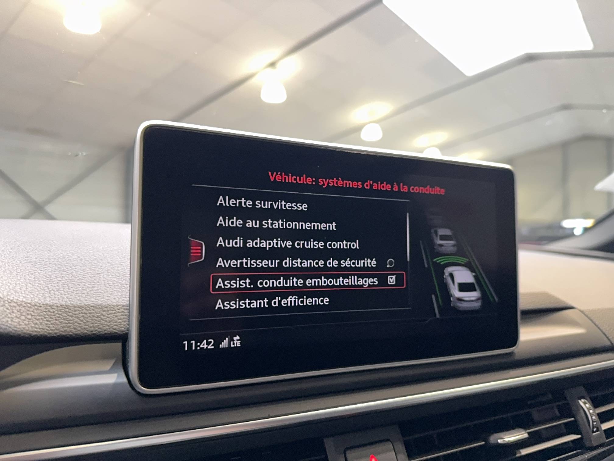- Pack Assistance Route : Adaptive Cruise Control stop & go avec Assistant de conduite en embouteillage, Assistant de conduite efficiente, Audi Pre Sense Front avec Assistant d'évitement collision et Assistant changement direction, Pack Audi Lane Assist