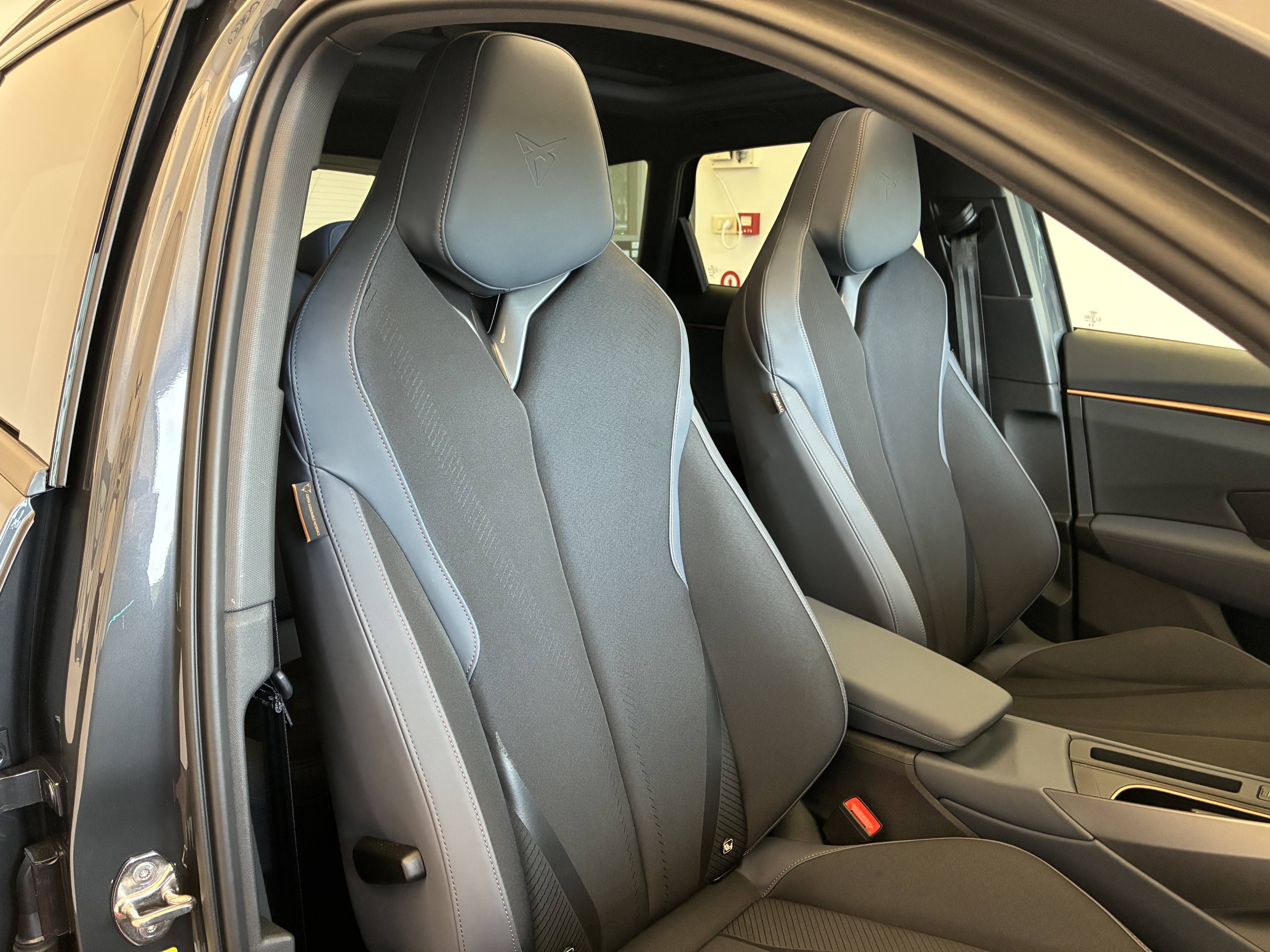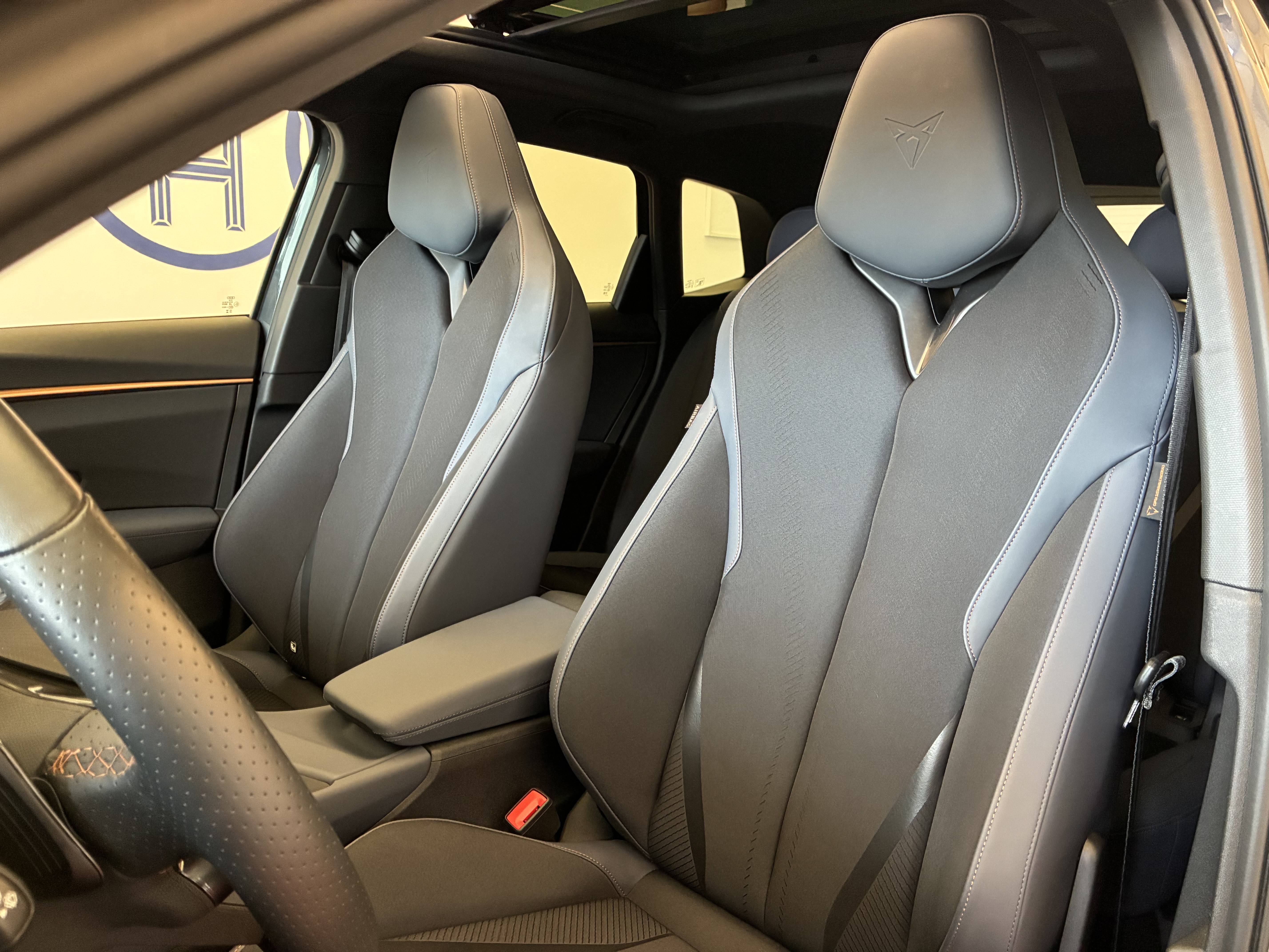 - Design Intérieur Deep Ocean (sièges baquets TEP + textile Bleu Acier) - Logos CUPRA estampés sur les appuie-têtes - Planche de bord bleu acier texturée avec aérateurs cuivrés - Contre-portes en TEP noir texturé - Ciel de pavillon noir - Sièges conducteur et passager avec réglage manuel en hauteur et lombaire