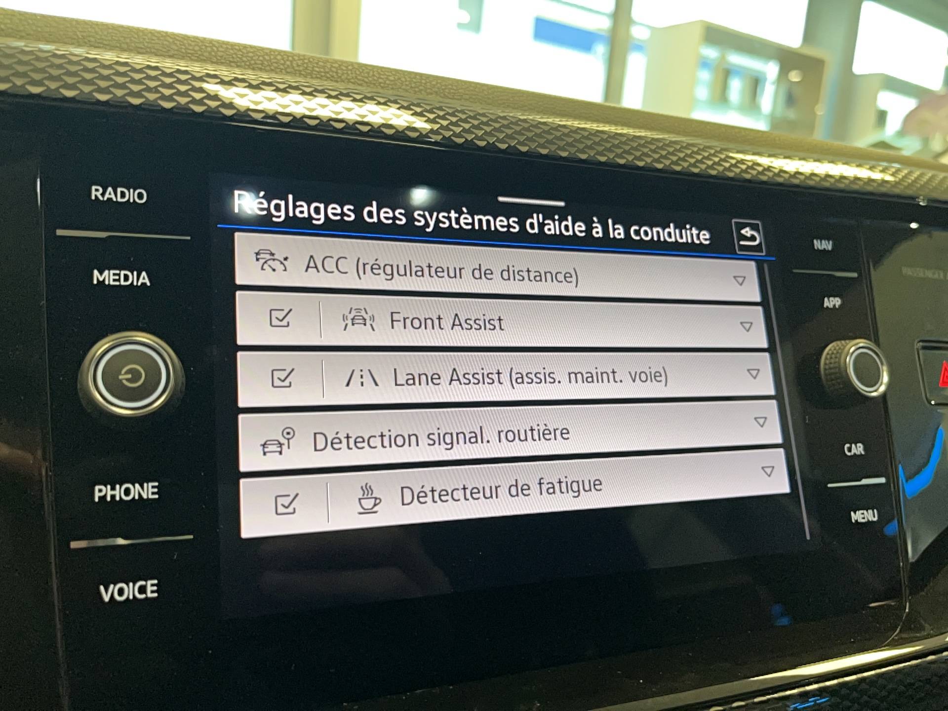 - Fatigue Detection : système de détection de fatigue du conducteur qui analyse le comportement du conducteur et recommande un temps de repos par l'apparition d'un message visuel et sonore