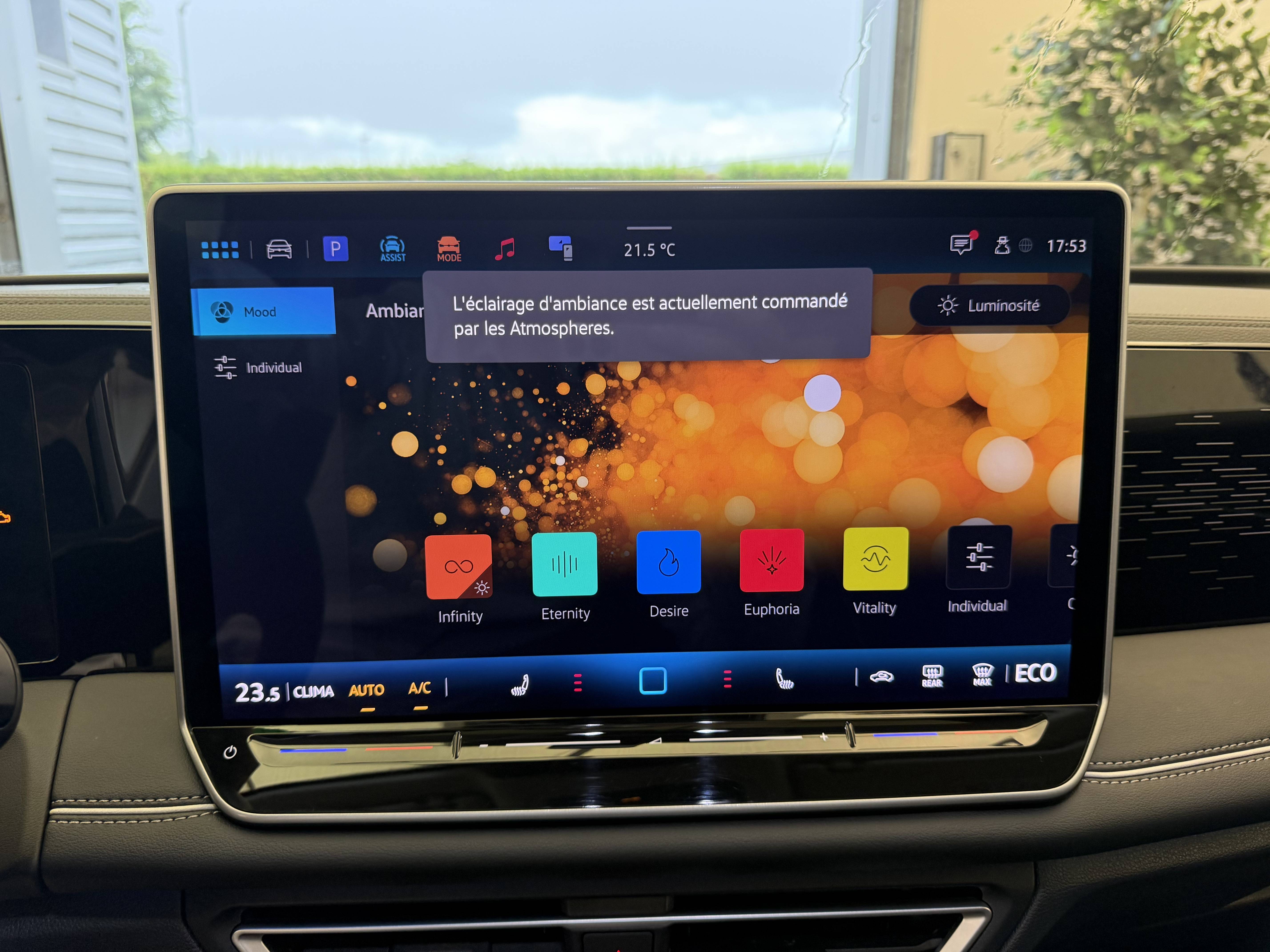 - Drive Experience Control: Sélecteur de profil de conduite avec écran OLED tactile - Permet d'ajuster le volume, le profil de conduite ainsi que les "Atmosphères" - Appuyer sur le sélecteur pour afficher les profils de conduite, passez votre doigt sur l'écran tactile pour basculer sur le choix des "Atmosphères" - Des "Atmosphères" sont déja paramétrées dans le véhicule mais vous pouvez créer vos propres atmosphères en définissant une playlist, un affichage Digital Cockpit, un éclairage d'ambiance, un niveau sonore et une tonalité